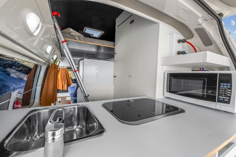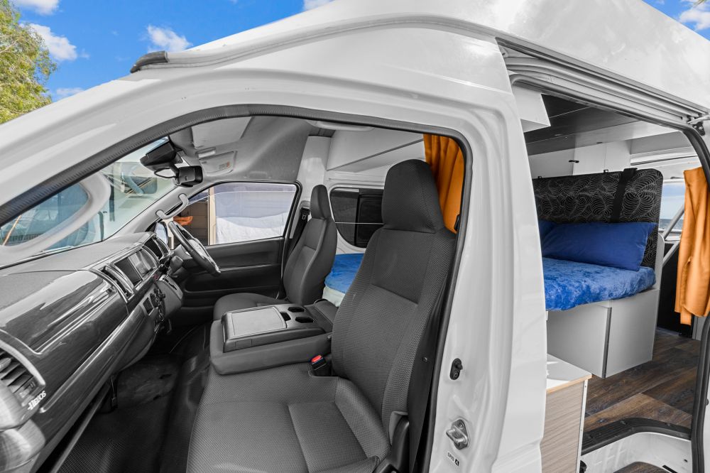 The Maxie 4 deluxe model is perfect for a family or a group of four friends. The Maxie 4 model includes two double beds inside the campervan. The Maxie 4 model also provides practical storage areas for groups and families travelling with luggage. This model includes a shower & toilet, and the shower is operational with hot & cold water.