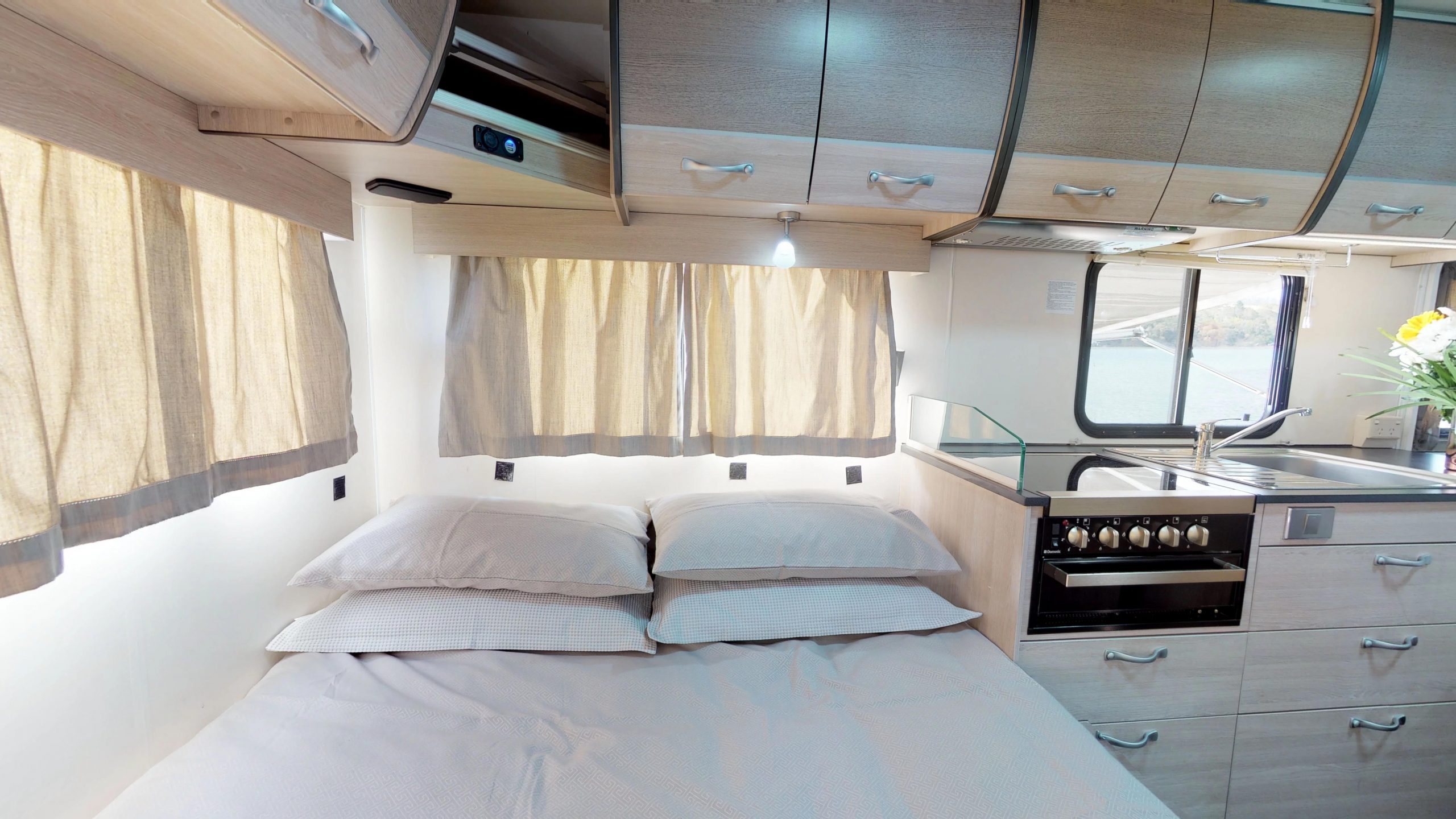 Embark on an adventure with the Cruisin’ 4 Berth Adventurer, an affordable motorhome hire designed for budget-conscious families. This compact and cosy motorhome hire offers the benefits of space and convenience with a generously-sized living area and a fully functional kitchen equipped with all the essentials you’ll need for a great holiday. From the fridge to the microwave, gas stove, and sink, preparing budget-friendly home-cooked meals has never been easier!