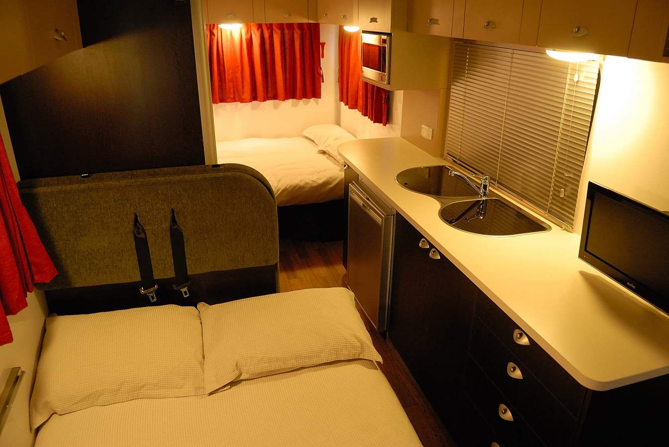 Other facilities provided on-board this innovative motorhome include fly screens, a 100 litre water tank and linen and towels to accommodate the entire family. Baby and booster seats, a GPS and a fan heater are all available for you to hire on request for a small fee.
