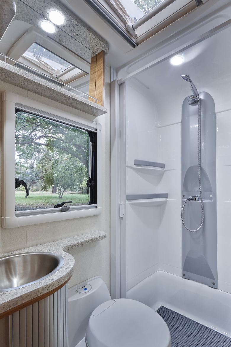 Our motorhomes have a shower and toilet, sink, cooktop, oven, microwave, air conditioning and fridge. All motorhomes have a solar panel which helps maintain charge to the house battery.