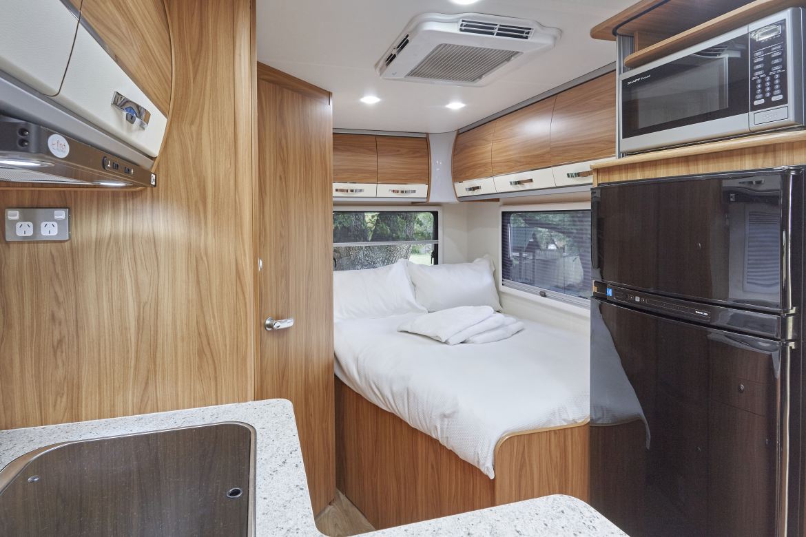 There is one double bed located at the rear of the Motorhome and is permanently set up. The dinette converts to a second double. Rent from Hobart or Launceston Tasmania, drop-off at either LeisureRent branch.